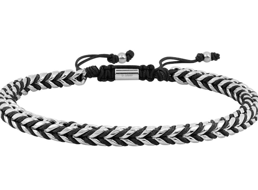 Bracelet pour homme en acier inoxydable et cordon nylon noir. Longueur : 17.5 – 25 cm