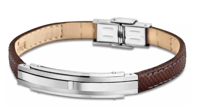 Bracelet Lotus en acier inoxydable et cuir marron.
