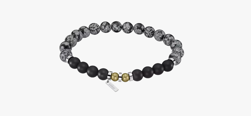 Bracelet Lotus Style en acier inoxydable avec 8 boules de résines noires et 16 grises.