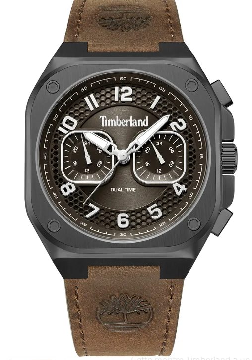 Montre Timberland pour homme en cuir marron avec le cadran noir et sa fome rectangulaire. Étanchéité 5 ATM.