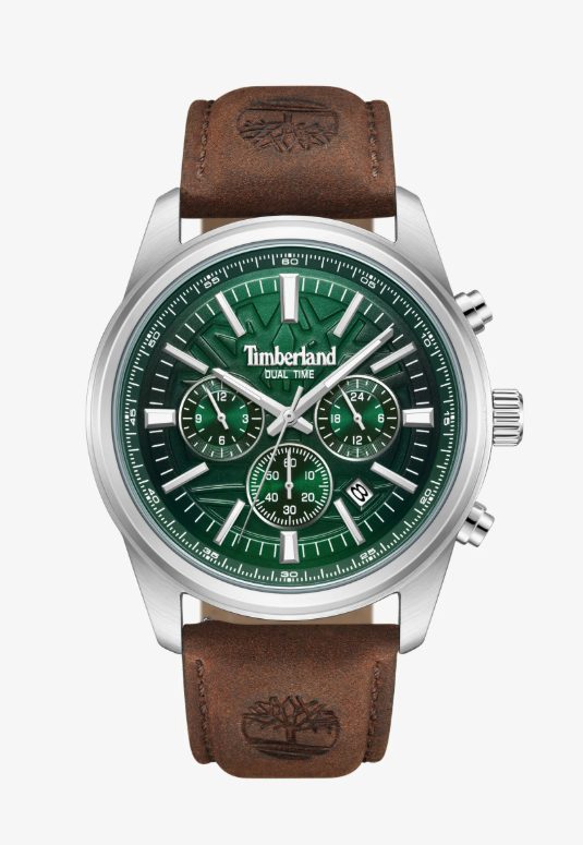 Montre Timberland pour homme en cuir marron avec le fond du cadran vert et sa forme ronde. Étanchéité 5 ATM