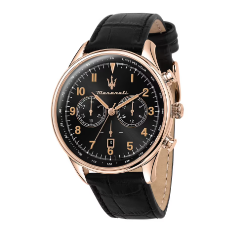 Montre Maserati, collection Tradizione, mouvement miyota, analogique, verre minéral, cadran rond, cuir noir.