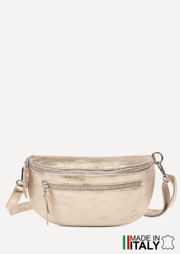Sac Banane bandoulière en cuir de vachette métallisé, vernis plissé, fermeture zippée. Disponible en d’autres couleurs.