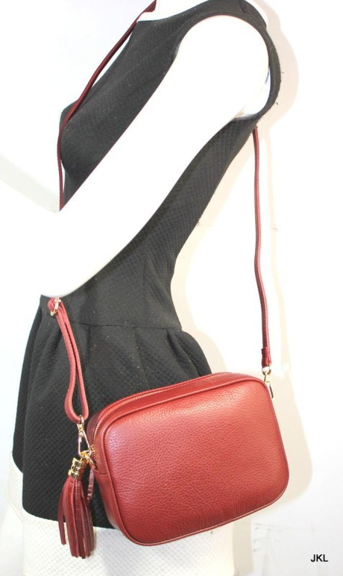 Sac pochette en bandoulière en cuir grainé avec bandoulière amovible. Poche zippé et pompon. Disponible en plusieurs coloris
